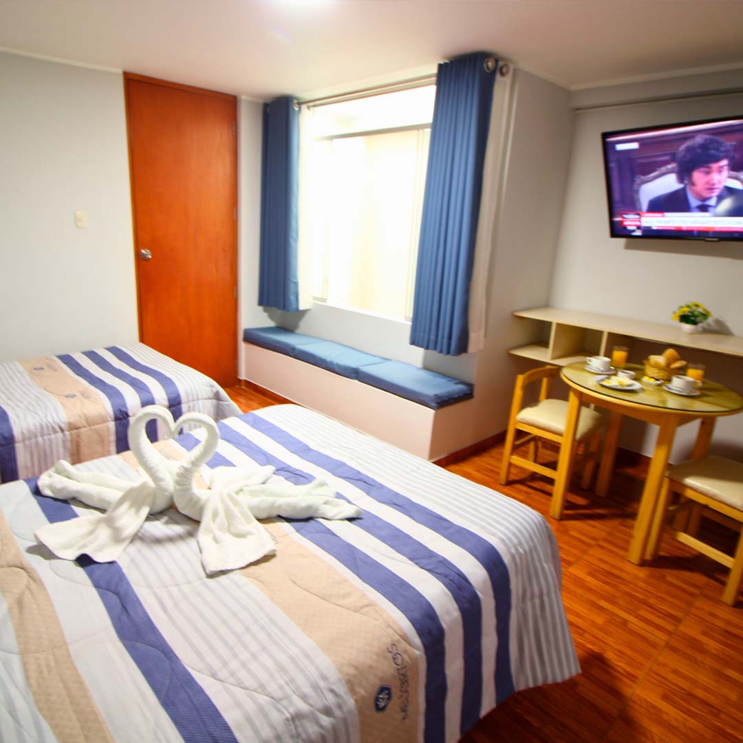 ¡Descubre el confort y la elegancia en nuestra Habitación Doble del Hostal Takora Inn! Ubicada estratégicamente en el corazón de Tacna, esta habitación ofrece un refugio acogedor y sofisticado. Con una decoración cuidadosamente seleccionada y un ambiente sereno, te aseguramos una estadía cómoda y relajante.